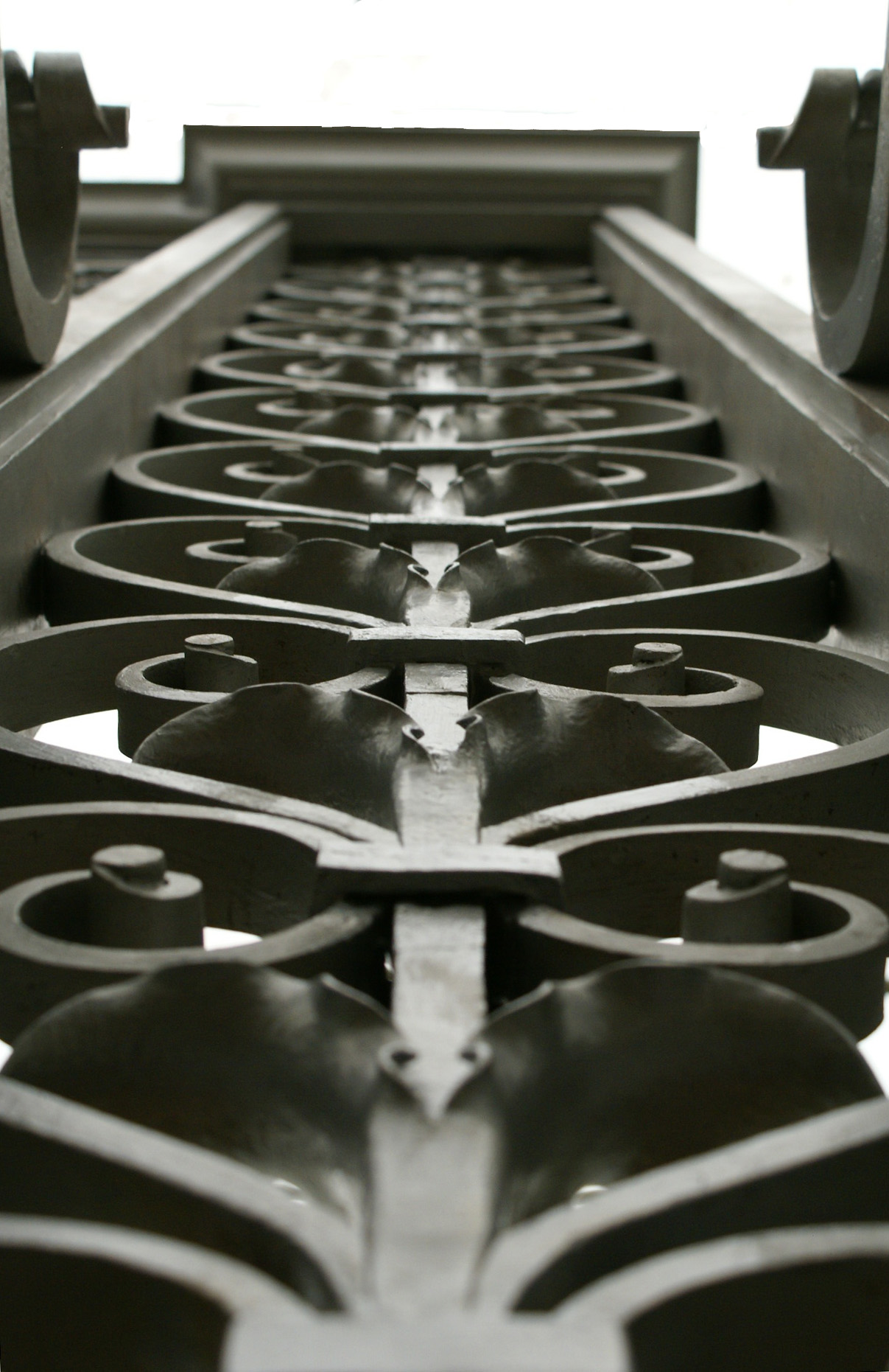 The picture above is looking up at the gate pier scrolls and is an excellent example of the work done by the blacksmiths on this project. nearly all the leaves and most or the collars on this one section alone needed repair or replacement. the close proximity of the symmetrical forms meant that the work was a real test for their reproduction skills, because any less than perfect will be obvious to everyone.